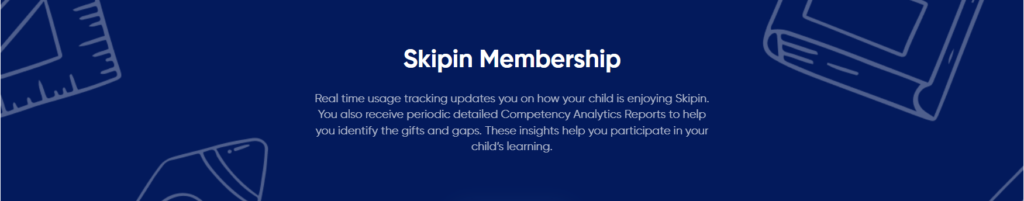 Real time usage tracking updates you on how your child is enjoying Skipin. You also receive periodic detailed Competency Analytics Reports to help you identify the gifts and gaps. These insights help you participate in your child’s learning.